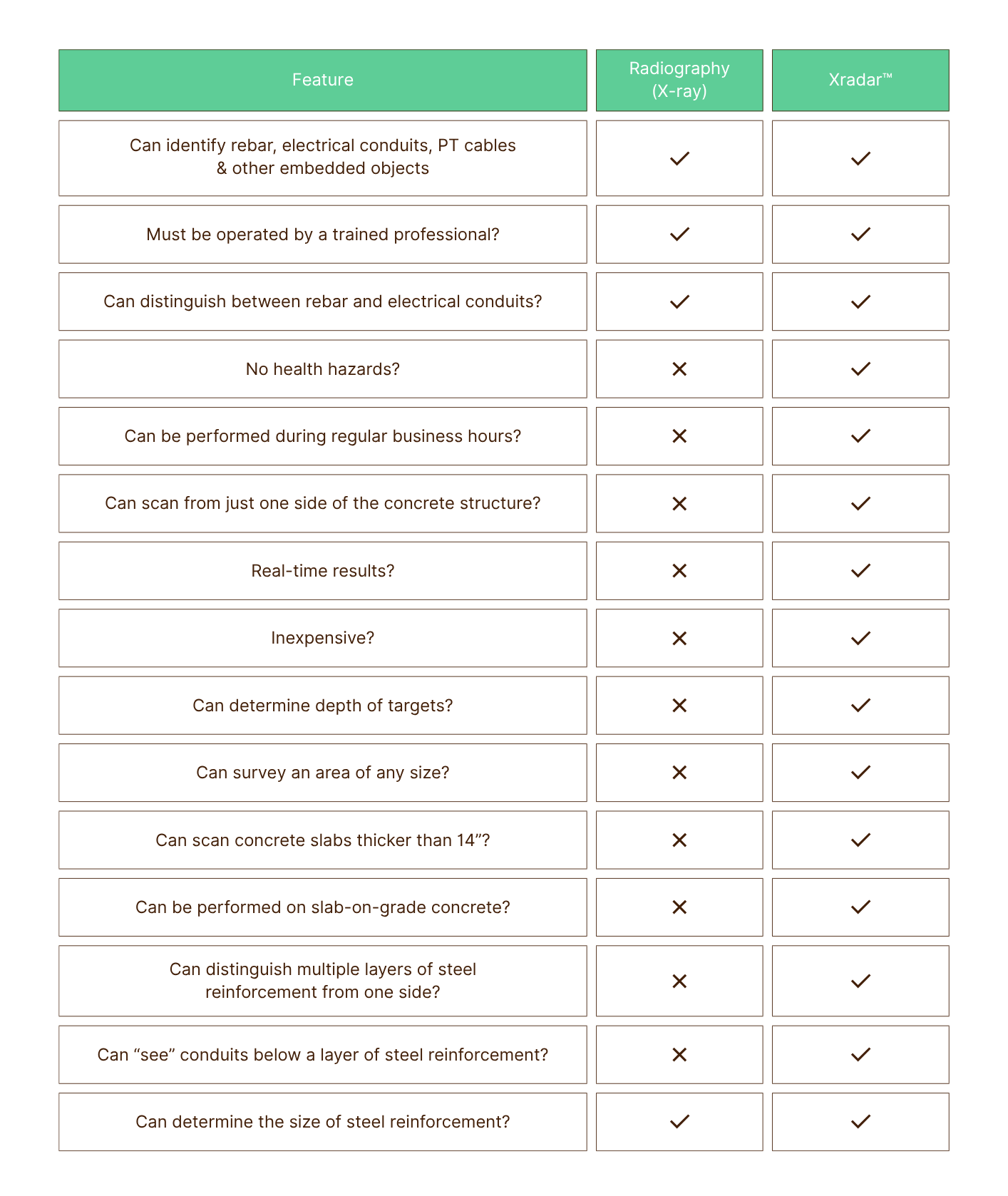 - Depth limitations: X-ray typically cannot penetrate below a maximum slab thickness of 12-14”. You also need to know the slab thickness before commissioning X-ray, which can often cause challenges.